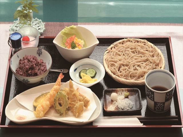道の駅豊平どんぐり村、どんぐり荘内にある食事処。広々とした座敷や、龍頭山を眺めながら食事ができるテラス席も完備。手打ちそばはもちろん、地元の食材を使った料理も豊富にそろう。