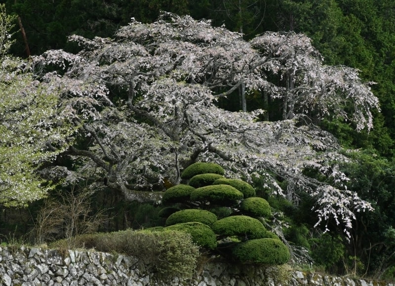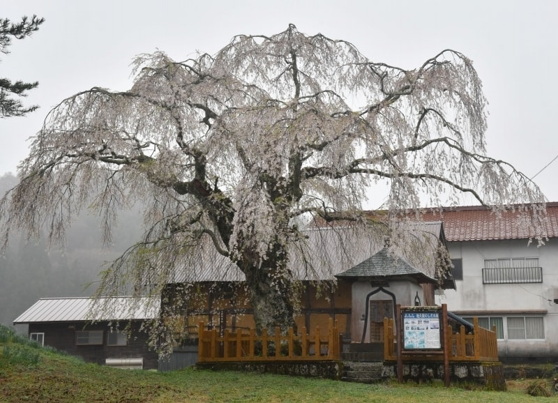 北広島町の天然記念物に指定されているしだれ桜。大きく広がった枝にはたくさんの花が咲く。一度倒伏したものを村人の力で復旧した。推定樹齢は約420年。
