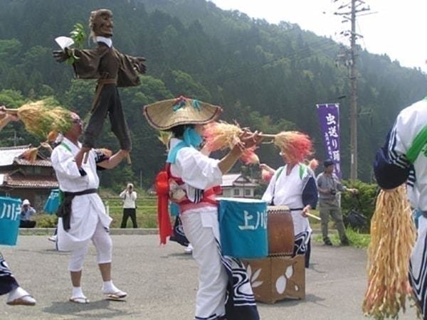 田植えがめでたく終わり、稲が成長を始める頃、泥負い虫、ナカザシ、ウンカなど、稲の生育に害を与える虫が発生する。享保17(1732)年の大飢饉は、ウンカによる被害が原因ともいわれており、先人たちは、このような害虫を追い払う呪法として藁人形を作り、川に流す「虫送り踊り」を行った。中部以西では、藁人形を「サネモリさん」といい、サネモリさんは斉藤別当実盛という平家方の武将のこと。嘉永2年(1183年)源平合戦において、平家の武将斉藤別当実盛が水田の稲の切り株につまずき、あえなく最期を遂げる際、「我は害虫になって、水田にたたる」と言い残したとの言い伝えがあり、実盛の怨霊が害虫となり田畑を荒らすと考えられ、サネモリ人形をつくり、稲に付く害虫の御霊をこれに移し村境で川に投じて追放することで、稲の病虫害を防ぎ、五穀豊穣を祈願すると考えられてきた。虫送り祭りは、民俗行事を伝承するものであり、上川戸熊野神社での神事や腰に付けた小太鼓の音や笛、手打ち鉦の拍子に合わせてサネモリ人形を振りかざしての行列など素朴な踊りが展開される。
